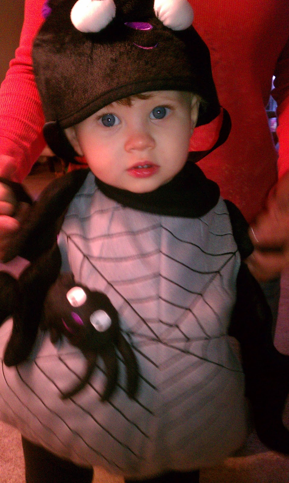 Originally I wanted Madison to be a vampire and me to be her victim (cuz she's sucking the life out of me) but apparently that is "inappropriate" - and honestly I couldn't find a good baby vampire costume. Instead nutterlicious was a fat spider (I am terrified of spiders):